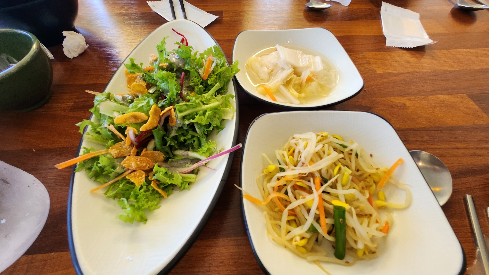 꼬막 비빔밥과 육전으로 먹음직스럽게 플레이팅 되어